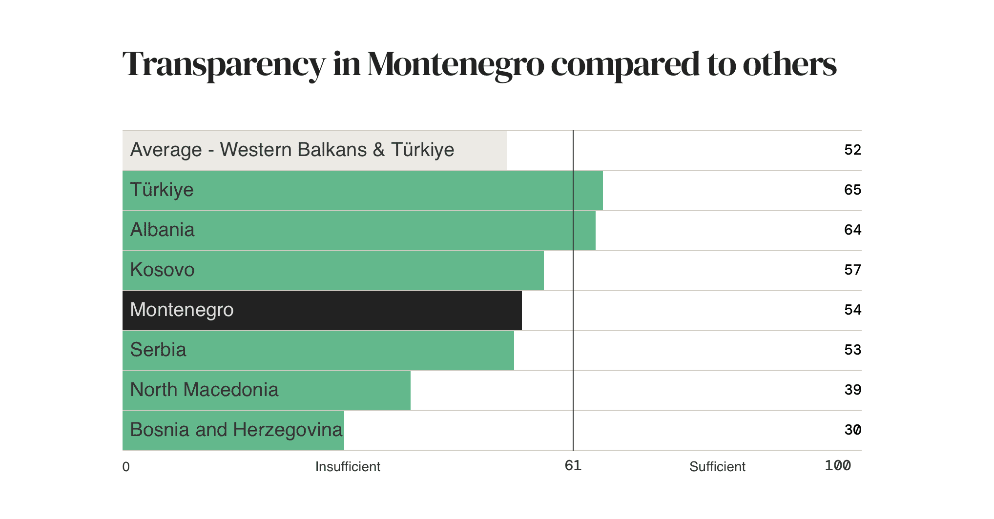 Indeks mjeri obim i sadržaj informacija o tome kako izvršna vlast prikuplja i troši javni novac, procjenjujući dostupnost, pravovremenost i sveobuhvatnost ključnih budžetskih dokumenata, dodjeljujući svakoj zemlji ocjenu na skali od 0 do 100. U regionu, Albanija i Kosovo su u pogledu budžetske transparentnosti ostvarile bolji rezultat od Crne Gore, dok su Srbija, Sjeverna Makedonija i Bosna i Hercegovina zabilježile lošiji.